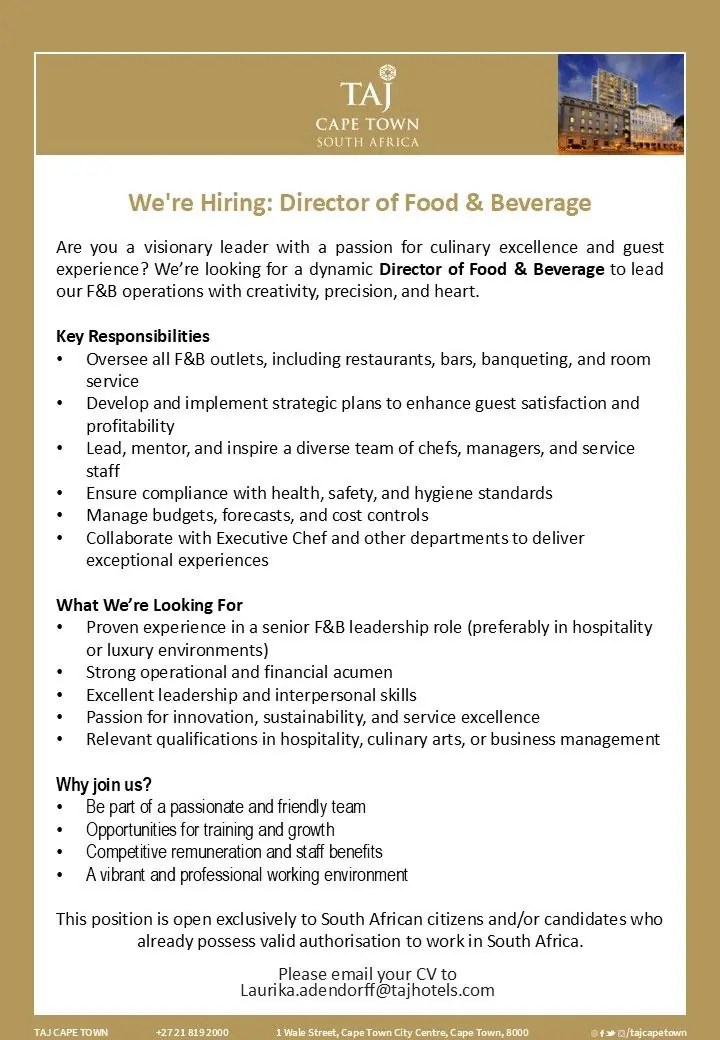 This job listing was provided by Hospitality Job Vacancies. To apply, please use the link in the job description.