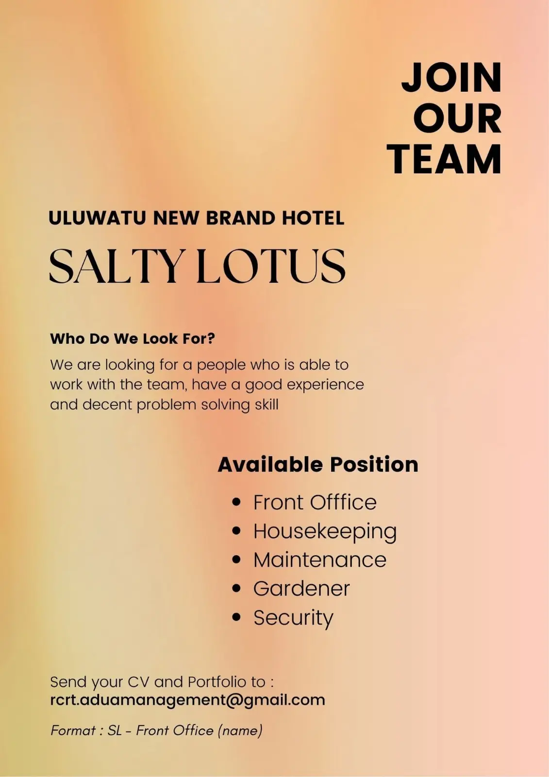 ITC Grand Goa is looking to hire the following: Spa therapist Guest Relation Associate Housekeeping Supervisor Goan MasterChef PR Manager Interested candidates may send across their resume to me at marika.coutinho@itchotels.com