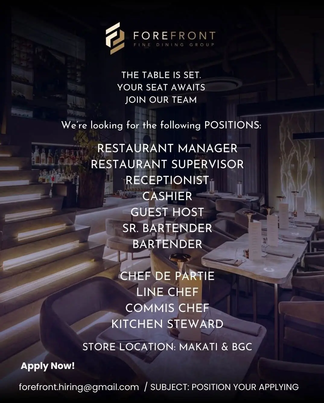 OSITION SUMMARY   Our jobs aren’t just about putting food on the table that our guests will enjoy until they ask for their bill. Instead, we want to build an experience that is memorable and unique – with food and drinks on the side. Our Guest Service Support Experts take the initiative and deliver a […]
