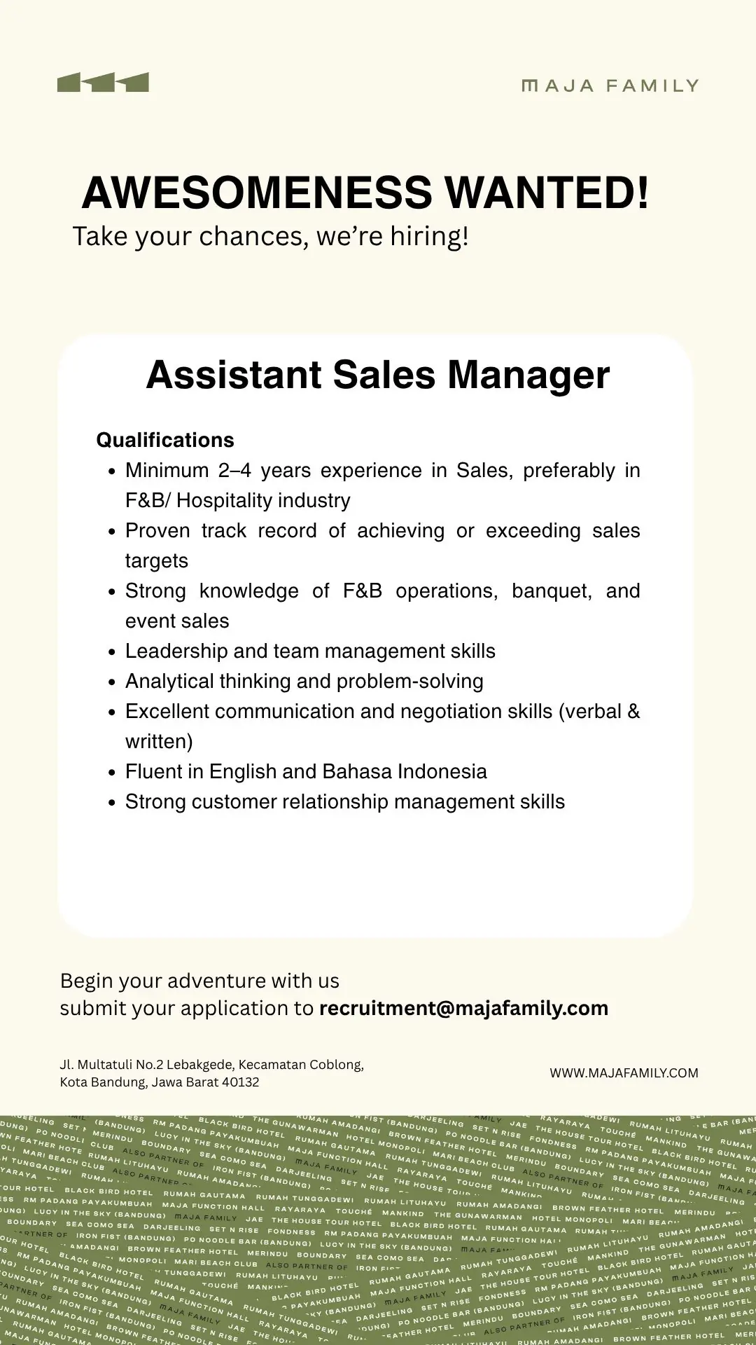 An Assistant Director of Sales manages the hotel sales and marketing plans by recommending growth efforts, monitoring progress, and ensuring that the hotel is competitively positioned within the local marketplace. What will I be doing? As Assistant Director of Sales, you will be responsible for working closely with the Senior Management Team to drive business […]